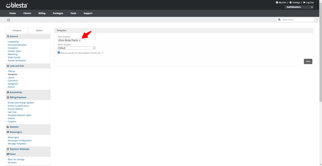 Before uninstalling any Blesta theme, changing your “Template” and “Order Form Template” back to something currently installed is always a great idea. To do so, you’ll need to log in to your Blesta admin account and navigate to “Settings”> “Company”> “Look and Feel”> “Templates.”