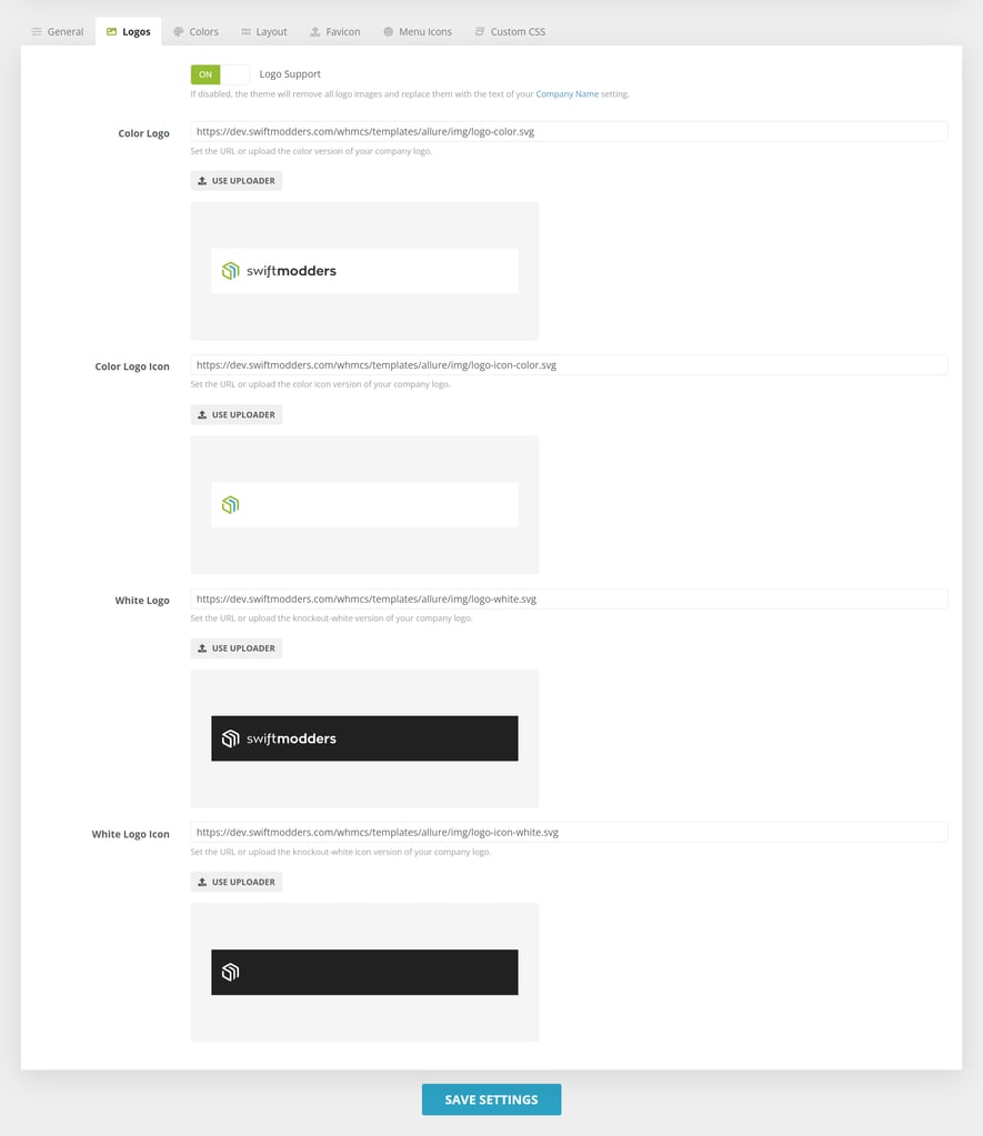 If you want to avoid using a logo, you can completely disable its use. Disabling “Logo Support” will replace your logo with a text version of your Company Name. If your company name is quite long, it will automatically be truncated in the header utilizing CSS. For those who wish to use logos, you can replace the following fields with your logo URL: