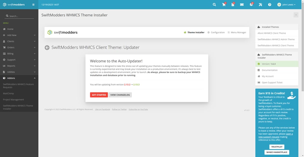 Once your upload has been completed, you will need to log in to your WHMCS admin portal and navigate to “Addons”> “SwiftModders WHMCS Theme Installer.” You should see an “Update” option next to your theme installation. If you do not see this option, make sure you have uploaded the theme folder to the correct location. If you continue to have problems, please open a support request.