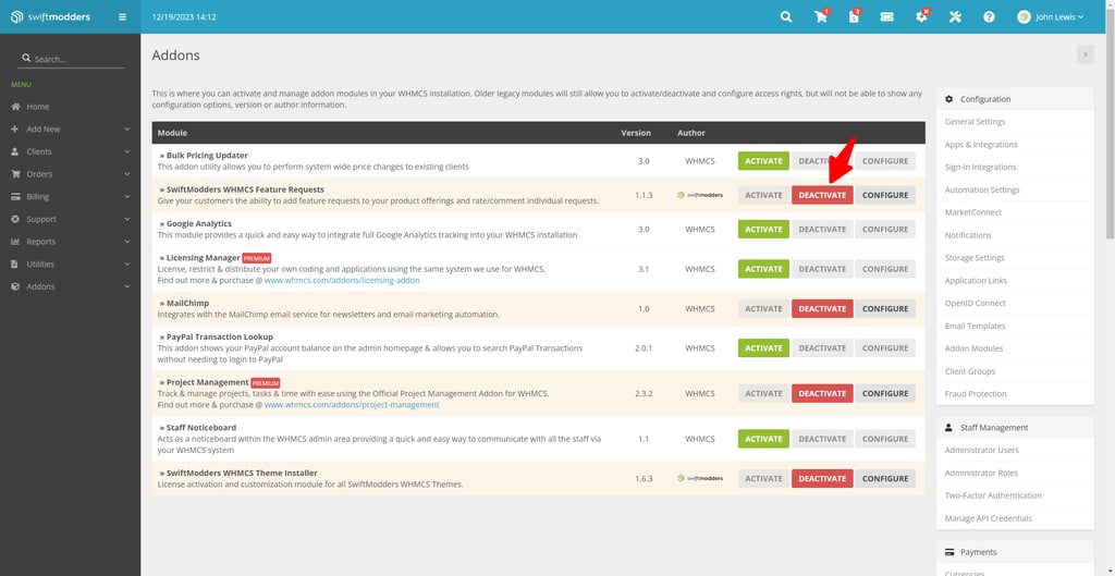 1. Deactivating the SwiftModders WHMCS Feature Request module